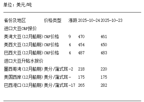 10月24日進口大豆到國內港口C&F及升貼水報價