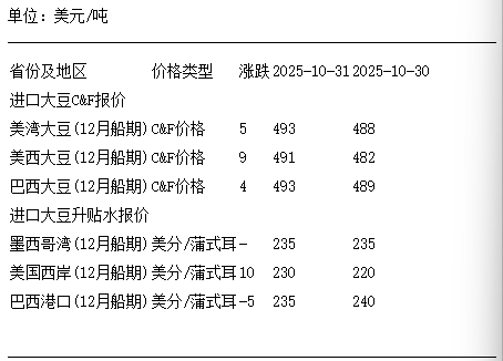 10月31日進口大豆到國內港口C&F及升貼水報價