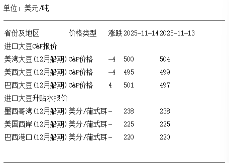 11月14日進口大豆到國內港口C&F及升貼水報價
