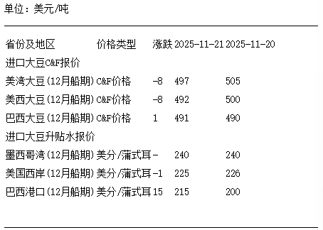11月21日進口大豆到國內港口C&F及升貼水報價