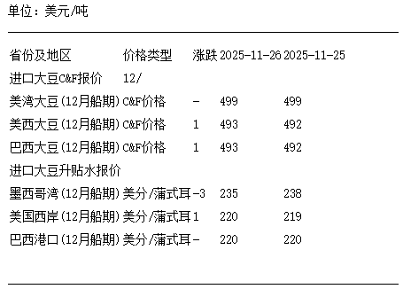 11月26日進口大豆到國內港口C&F及升貼水報價