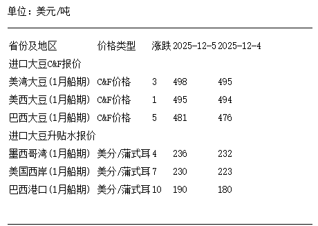 12月5日進口大豆到國內港口C&F及升貼水報價