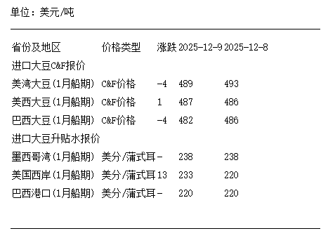 12月9日進口大豆到國內港口C&F及升貼水報價