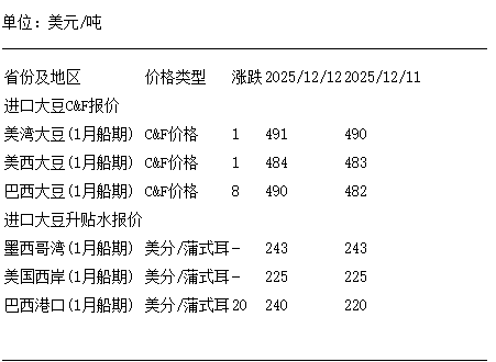 12月12日進口大豆到國內港口C&F及升貼水報價