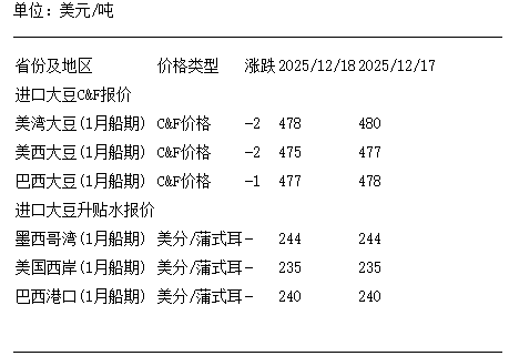 12月18日進口大豆到國內港口C&F及升貼水報價