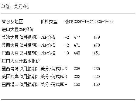 1月27日進口大豆到國內港口C&F及升貼水報價