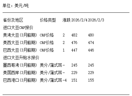 2月4日進口大豆到國內港口C&F及升貼水報價