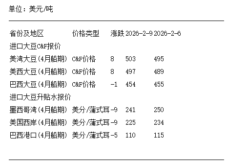 2月9日進口大豆到國內港口C&F及升貼水報價