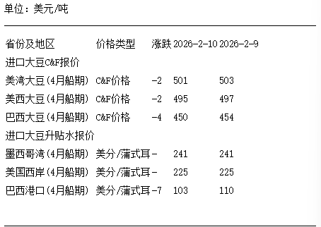 2月10日進口大豆到國內港口C&F及升貼水報價