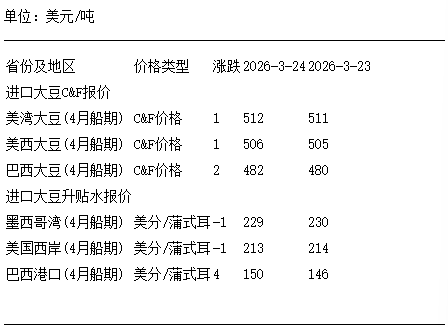 3月24日進口大豆到國內港口C&F及升貼水報價