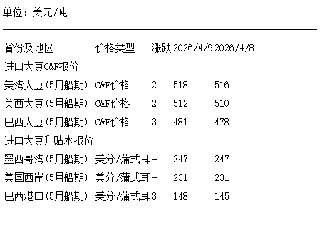 4月9日進口大豆到國內港口C&F及升貼水報價