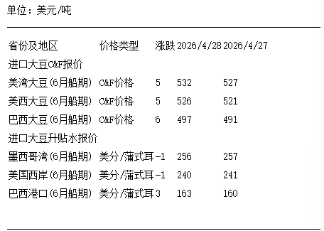 4月28日進口大豆到國內港口C&F及升貼水報價