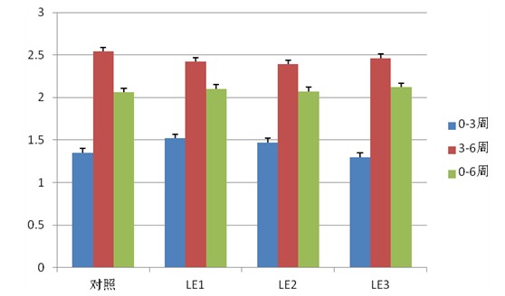所有實驗組肉雞的飼料轉化率總結如圖2。生長第一階段,LE1組(1.52)和LE2組(1.47)分別比對照組高12.59%和8.88%。但是,LE3組(1.3)比對照組(1.35)低4%。生長第二階段(3-6周),LE1組(2.42)和LE2組(2.39)分別比對照組低2%和3%。而LE3組(2.46)比對照組(2.54)高3.25%。整個實驗階段,LE1組(2.1)、LE2組(2.07)和LE3組(2.12)比對照組(2.06)分別高1.94%、0.84%和2.91%。作為部分結論,飼料中加入小麥提高了飼料轉化率2.91%。gNY中國飼料行業信息網-立足飼料,服務畜牧