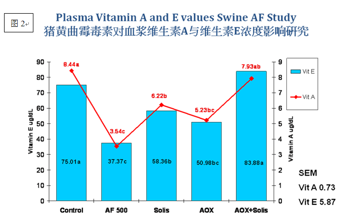 要解決霉菌毒素對豬造成的危害(即解毒),除了選擇親和力高且廣譜吸附毒素的霉菌毒素處理劑外,如何降低進入體內的霉菌毒素毒性,變成為極具挑戰的難題。研究結果顯示(見圖2),機體攝入含霉菌毒素的日糧后,血漿中用來保護細胞免受氧化損傷的維生素A與維生素E濃度水平急劇下降。單純使用對霉菌毒素具有廣譜吸附能力的諾偉司索霉清或是抗氧化劑,對改善維生素A與維生素E濃度有一定效果。但若能聯合使用清除能力佳的霉菌毒素吸附劑(索霉清)+ 優質抗氧化劑--索霉清MOS,血漿中維生素A與維生素E濃度將回復至健康水平,有效提高了細胞抗毒能力,并降低呼吸道與消化道疾病發生的機率。如果使用一部分霉變的飼料或原料,還建議提高飼料中蛋氨酸的添加量。因為被吸收進血液的霉菌毒素由肝臟負責解毒。肝臟中黃曲霉素解毒作用的生物學降解、氧化反應是以谷胱甘肽為基礎的。谷胱甘肽的部分組成就是蛋氨酸和胱氨酸。因此,這一過程將消耗蛋氨酸,影響生長和生產性能。故當飼料受黃曲霉素污染影響時,也推薦加入更多的蛋氨酸。Chd中國飼料行業信息網-立足飼料,服務畜牧