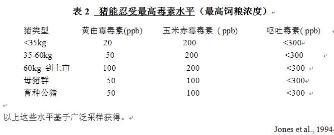 豬對霉菌毒素相當敏感,尤其對乳豬。一般而言,當霉菌毒素含量低時,導致飼料采食量減少、生產性能降低和免疫功能下降。生產者必須意識到,當飼料中發現有一種霉菌毒素存在時,其它霉菌毒素存在的幾率很高。到目前為止,一些毒素還沒有被識別,但是對已知霉菌毒素的調查,給人們提供了降低霉菌毒素對豬影響的潛在方法。表2列出了部分霉菌毒素在豬飼料中的最大允許濃度。 Chd中國飼料行業信息網-立足飼料,服務畜牧