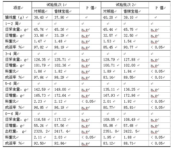 本試驗結合香辣寶6930產品具有提高消化力,增加日糧能量濃度的特點將日糧的代謝能濃度降低了25 kcal/kg,同時將香辣寶6930按照100 ppm添加到試驗雞日糧中,觀察試驗雞的生長性能和存活率的表現,最終對該產品進行一個綜合的初步評估,本試驗結果表明,香辣寶6930可以提高肉雞出欄重3%以上,料重比降低3.5%左右,對健康狀態稍差一點的雞表現出成活率改善顯著。P3X中國飼料行業信息網-立足飼料,服務畜牧