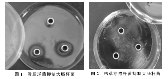 分別取糞腸球菌、枯草芽孢桿菌發酵菌液3ml,1000rpm/min 離心10min后,取100μl上清液。再用0.45μm濾器過濾除去菌體,收集濾液即為發酵濾液。使用牛津杯法,開展益生菌抑制大腸桿菌試驗。