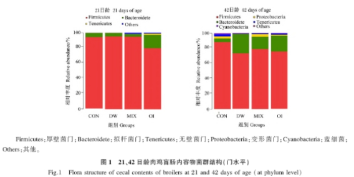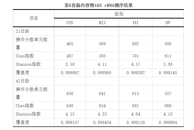 在21、42日齡時,每個重復隨機取1只肉雞屠宰,無菌采取左側盲腸內容物,液氮保存,送上海元華生物科技有限公司,利用Illumina測序系統對盲腸內容物菌群基因組DNA的16S rRNA V3~V4區進行高通量測序和生物信息學分析。