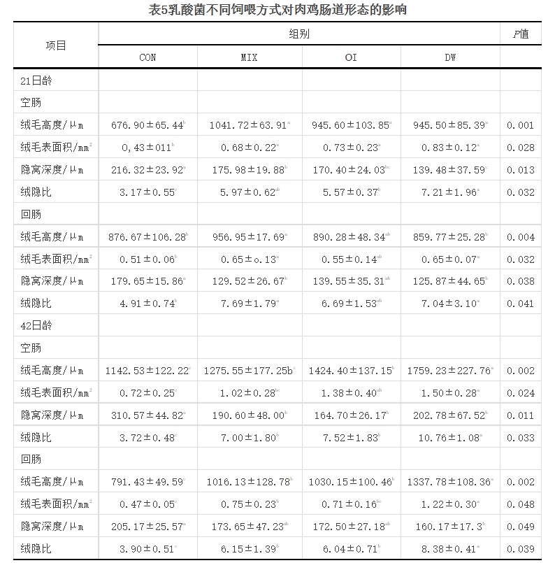 由表5可知,21日齡時,在空腸中,MIX組、OI組和DW組絨毛高度、絨毛表面積和絨隱比均顯著高于CON組(P<0.05),隱窩深度顯著低于CON組(P<0.05)。mix組、oi組和dw組絨毛高度、絨毛表面積差異不顯著(p>0.05);DW組隱窩深度顯著低于MIX組(P<0.05),與oi組差異不顯著(p>0.05);DW組絨隱比顯著高于OI組(P<0.05),與mix組差異不顯著(p>0.05)。在回腸中,MIX組絨毛高度、絨毛表面積、絨隱比顯著高于CON組(P<0.05),隱窩深度顯著低于CON組(P<0.05);DW組絨毛表面積、絨隱比顯著高于CON組(P<0.05),隱窩深度顯著低于CON組(P<0.05)。mix組、oi組和dw組之間絨毛 p="">0.05);DW組絨毛高度顯著低于MIX組(P<0.05),與oi組差異不顯著(p>0.05)。