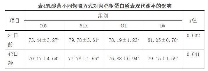 2.2 乳酸菌不同飼喂方式對肉雞粗蛋白質表觀代謝率的影響