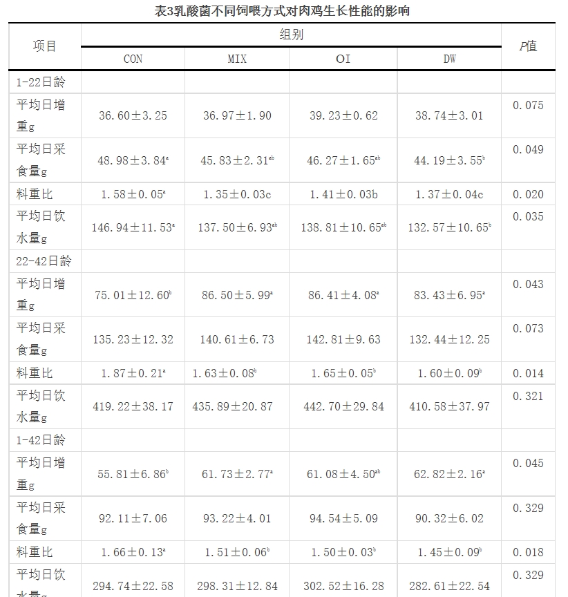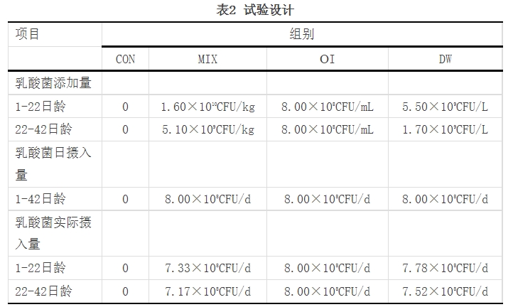 為保證各組肉雞每日采食乳酸菌活菌數基本相等(約8×108 CFU)。根據肉雞在飼養過程中水料比3:1原則、國家飼養標準及類似試驗參考值,確定AA肉雞平均日采食量(1~21日齡平均采食量48 g,22~42日齡平均采食量156g),通過計算確定不同飼喂方式下1~21日齡和22~42日齡的乳酸菌菌液添加量,如表2所示。MIX組每周及時進行拌料,OI組每日進行1次口腔灌服,DW組根據肉雞飲水情況及時向水箱中補充混有乳酸菌菌液的飲用水。