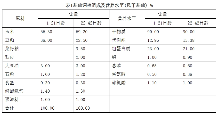 基礎飼糧:購自洛陽某飼料廠,基礎飼糧組成及營養水平見表1。