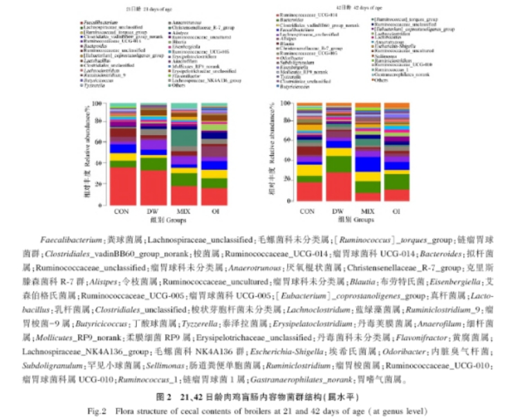 在屬水平上,各組優勢菌群如圖2所示。21日齡時,各組盲腸菌群主要菌屬為糞球菌屬;CON組糞球菌屬相對豐度為36.77%,MIX組為18.75%,0I組為18.91%,DW組為33.67%。毛螺菌科未分類屬也為優勢菌屬,MIX組毛螺菌科未分類屬相對豐度為12.34%,0I組為9.86%,DW組為12.76%。CON組糞球菌屬、梭菌屬相對豐度較高,分別為36.77%、6.08%。MIX組克里斯滕森菌科R-7群相對豐度最高,為16.12%。0I組令枝菌屬、乳桿菌屬相對豐度較高,分別為8.58%、4.58%。DW組毛螺菌科未分類屬、瘤胃球菌科UCG-014相對豐度較高,分別為12.76%、9.07%。