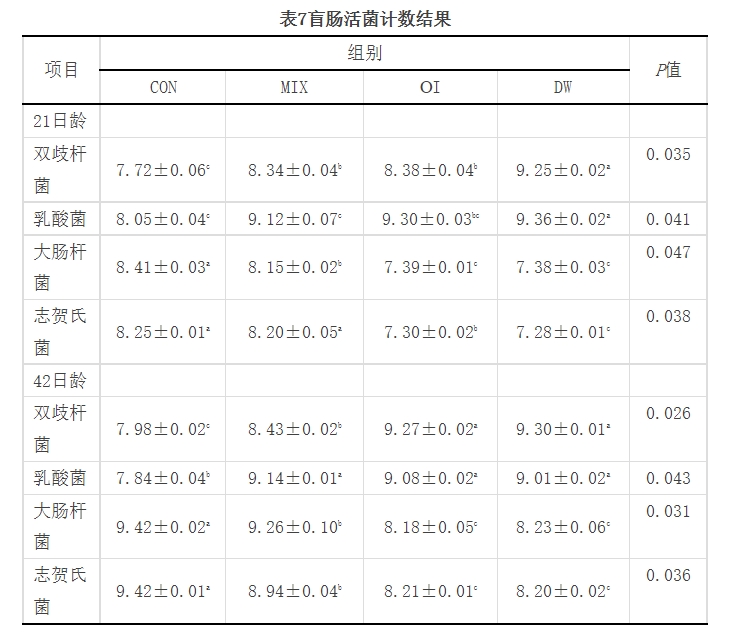 由表7可知,21、42日齡時,MIX組、OI組和DW組盲腸雙歧桿菌數量均顯著高于CON組(P<0.05),大腸桿菌數量顯著低于CON組(P<0.05)。21日齡時,DW組盲腸乳酸菌、雙歧桿菌數量顯著高于MIX組和OI組(P<0.05),志賀氏菌數量顯著低于CON組、MIX組和OI組(P<0.05),大腸桿菌數量顯著低于MIX組(P<0.05)。42日齡時,DW組、OI組盲腸雙歧桿菌數量顯著高于MIX組(P<0.05),大腸桿菌數量顯著低于MIX組(P<0.05)。