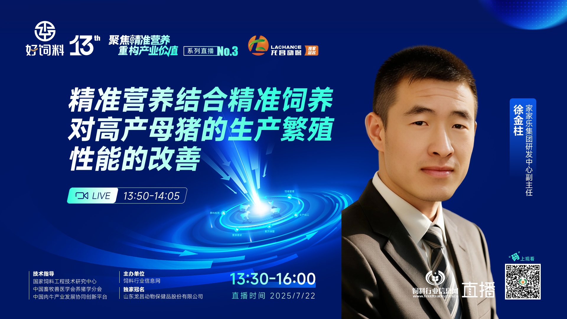 7月22日下午,“好飼料•第13季”系列直播活動的最后1場,“聚焦精準營養 重構產業價值”,來自成都鐵騎力士范明東、家家樂集團徐金柱、天津中升飼料劉佳昊博士、嘉吉動物營養與健康中國汪艷博士、龍昌動保張軍博士、湖南鑫百優王冰、湖南鑫美龍集團易學武博士、上海黑馬飼料卞國順以及福建新桂龍高文蓉9位老師分別從高性能哺乳母豬料的開發、精準營養如何助力增效降本、功能營養如何助力豬業健康發展、太湖豬多元化日糧配方定制服務、如何科學選擇膽汁酸產品、規模豬場定制產品應用方案、教槽料的產品特性、精準營養結合精準飼養對高產母豬的生產繁殖性能的改善以及教槽料系統解決方案等領域各自進行了詳細的闡述,讓我們受益匪淺、收獲滿滿。