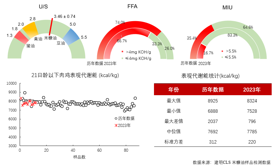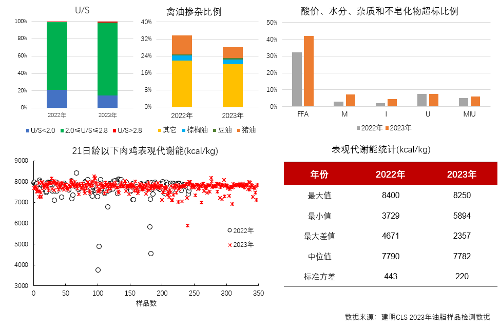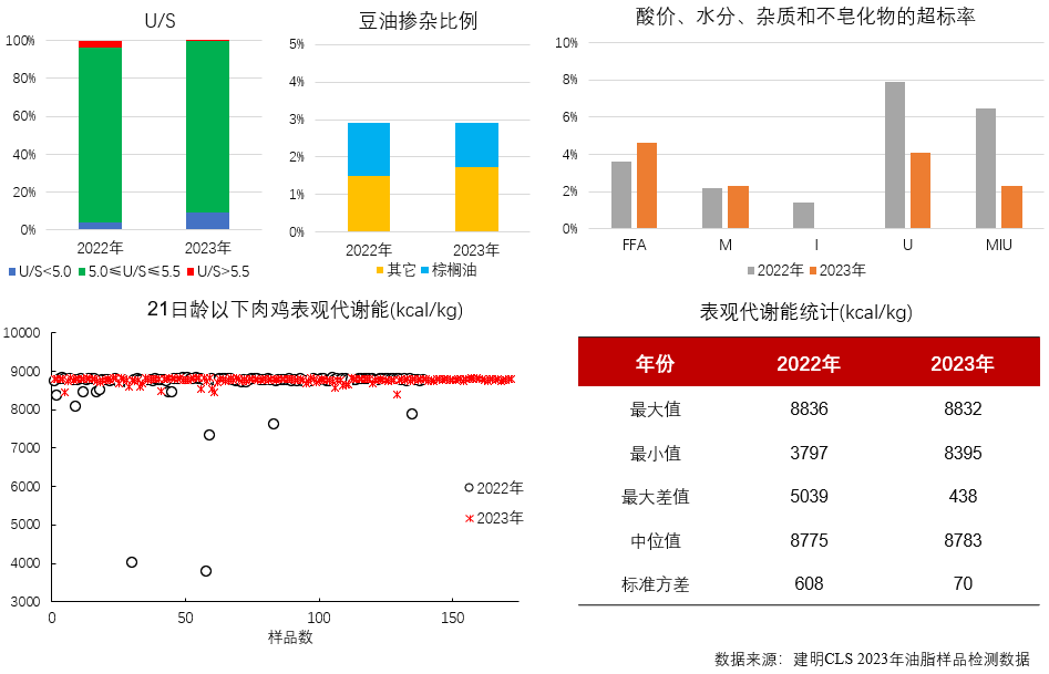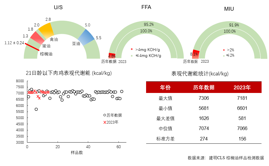 建明CLS實驗室對油脂的評估指標包括脂肪酸譜、不飽和脂肪酸與飽和脂肪酸的比例(U/S)、酸價(FFA)、水分(M)、雜質(I)和不皂化物(U),再通過Wiseman方程計算肉雞的表觀代謝能和豬的消化能。