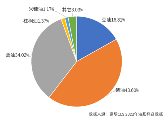 建明CLS實驗室在2023年共收到了來自全國17個省份的1023份飼用油脂,主要為豆油、豬油和禽油,總占比為94.4%。