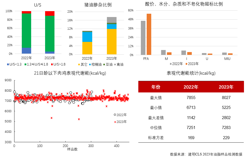 2023年禽油樣品的U/S值的正常比例比去年提高5.9%,摻雜比例比去年降低5.6%。