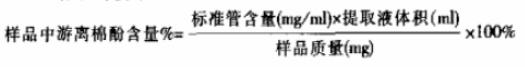 準確稱取樣品 0.01克,加70%丙酮5毫升,振蕩器上振蕩提取5~10分鐘,過濾或離心后取上清液備用;取樣品提取液2毫升于比色管中,加顯色劑2毫升,搖勻后放人50℃-55℃水浴中,顯色5分鐘;量取95%乙醇2毫升于另一比色管中,加提取液2毫升,搖勻,同樣放入上述水浴中,保持5分鐘,作為對照,將樣品管和對照管插入比色架中,和標準比色管比較,選取顏色深淺相同的標準管,此管所標出的數字,即為樣品中游離棉酚的含量。