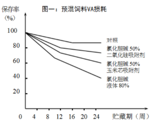 氯化膽堿具有強烈的吸濕性,它與微量元素(特別是銅、鐵、錳的硫酸鹽)相互作用下,對維生素的破壞性較大,據德國巴斯夫(BASF)公司介紹,以小麥細麩為載體,加有12.65%微量元素及10%氯化膽堿的維生素A預混料在室溫下貯藏24周后的維生素A損失情況如圖一所示: