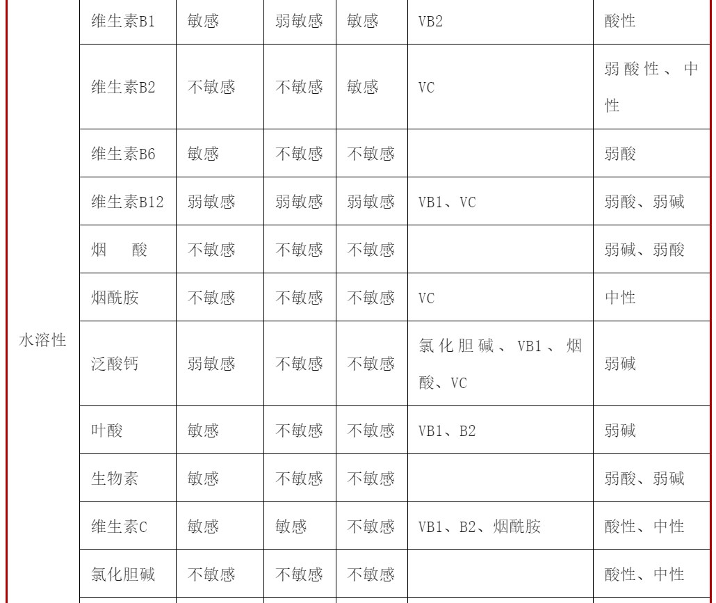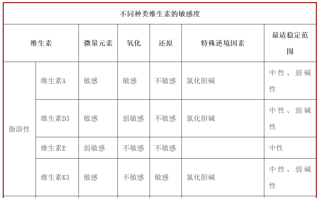維生素A、維生素D3、維生素K3、類胡蘿卜素最適穩定范圍為中性、弱堿性環境;維生素E、煙酰胺最適穩定范圍為中性環境;維生素B2最適穩定范圍為中性、弱酸性環境;維生素B1最適穩定范圍為酸性環境;維生素B6最適穩定范圍為弱酸環境;維生素 B12、煙酸、生物素最適穩定范圍為弱酸、弱堿環境;泛酸鈣、葉酸最適穩定范圍為弱堿環境;維生素C、氯化膽堿最適穩定范圍為酸性、中性環境。