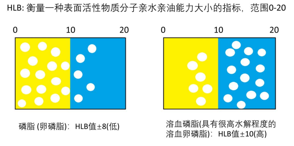 “瘦禸太”還含有6%的溶血磷脂,溶血磷脂是由溶血卵磷脂(LPC)、溶血磷脂酰乙醇胺(LPE)、溶血磷脂酰肌醇(LPI)、溶血磷脂酸(LPA)四種成分組成的。它作為一個生物乳化劑,它的乳化效果更強,更適合生物消化吸收。那么我們來看一下溶血磷脂的一些特點:第一個,就是我們溶血磷脂的HLB值,HLB值它是表示親水親油的一個平衡值,(圖二)