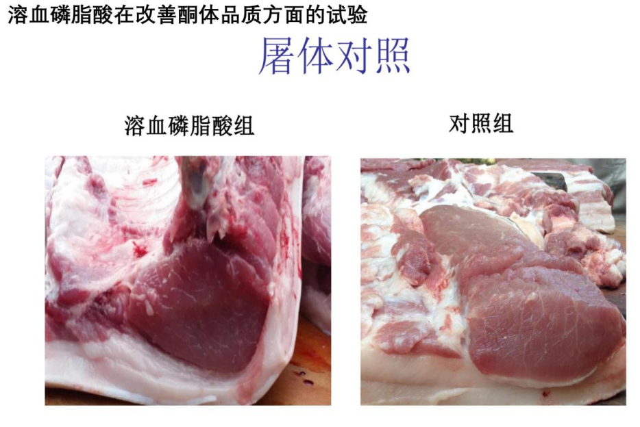 溶血磷脂酸還有一個功能,降低脂肪含量,脂肪細胞前體細胞與分化脂肪細胞的比例是影響脂肪沉積和積累的重要因素之一。許多因素調節前脂肪細胞的增殖和分化,溶血磷脂酸是其中之一(Nobusue H, Kondo D, Yamamoto M, Kano K. 2010年、Ferry G、Tellier E、Try A、Grés S、Naime I、Simon MF 等人,2003 年)。另外一個研究發現:溶血磷脂酸能激活蛋白通道A(PKA),激活環磷酸腺苷效應元件結合蛋白(CREB),CREB結合cAMP反應元件,啟動轉錄,促進肌肉蛋白生成,降低皮下脂肪。在杭州香保公司的試驗中發現,溶血磷脂酸能明顯降低豬的背膘厚。