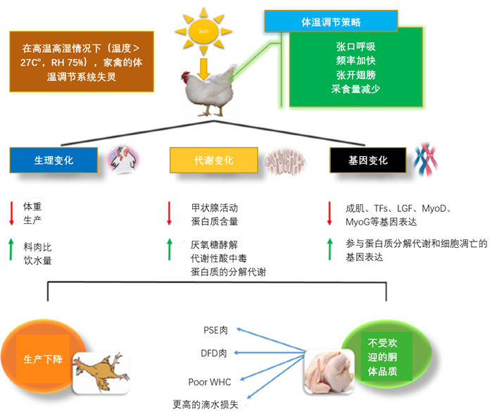 由此可見,熱應激嚴重影響了肉雞機體的生理、代謝和基因表達,從而顯著降低了肉雞的生產性能和肉質品質,見圖2。