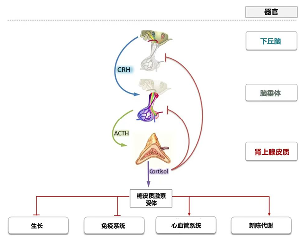 具體而言,由下丘腦分泌的促腎上腺皮質激素釋放激素(CRH)進入垂體前葉,刺激其產生促腎上腺皮質激素(ACTH),隨后ACTH則可以促使皮質醇(最主要的糖皮質激素)的分泌。