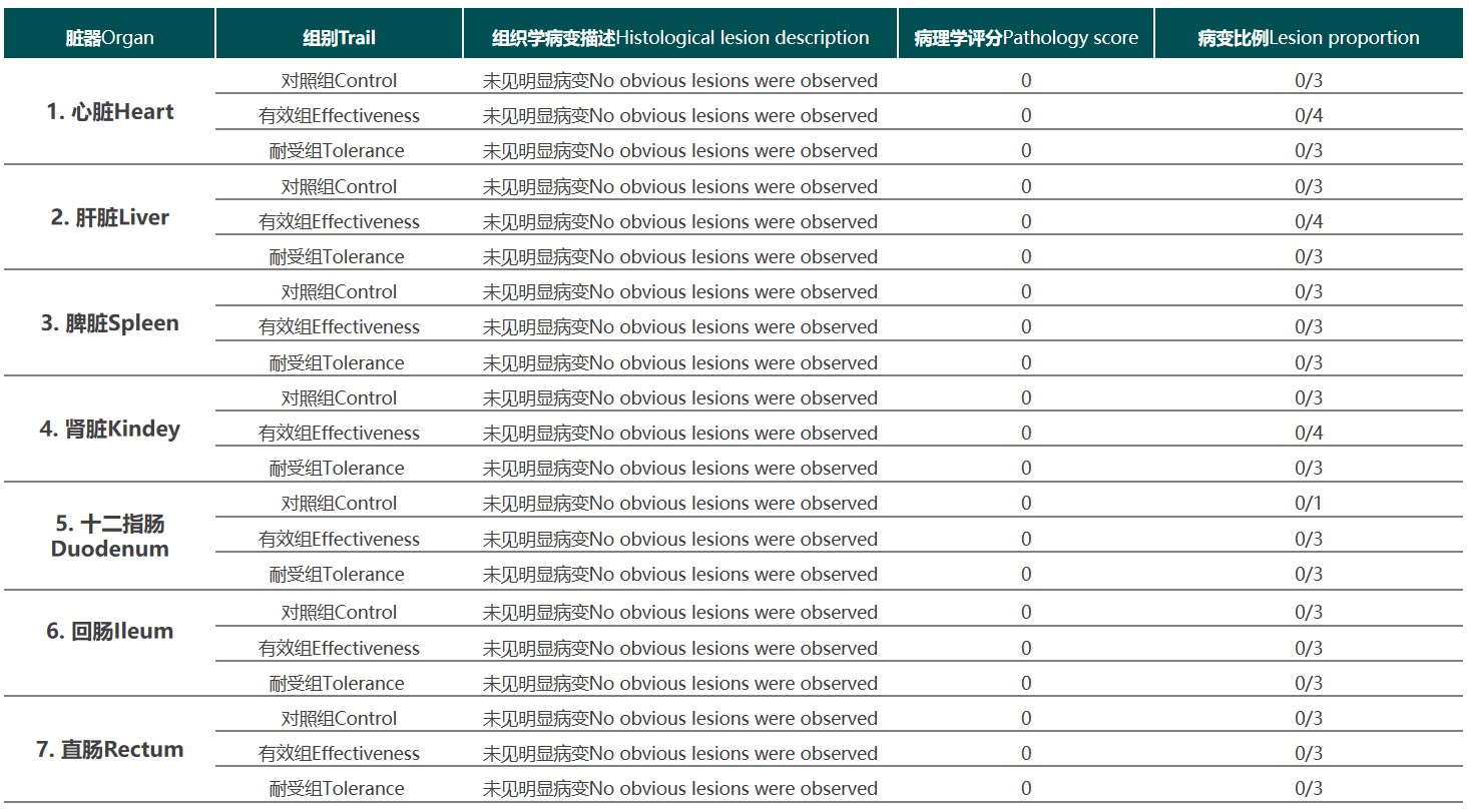 臟器指數檢測結果顯示,有效劑量組、超高耐受劑量組肉牛的心臟、肝臟、脾臟、肺臟、腎臟等核心臟器指數,與空白對照組均無顯著差異(P>0.05),各臟器發育完全正常。