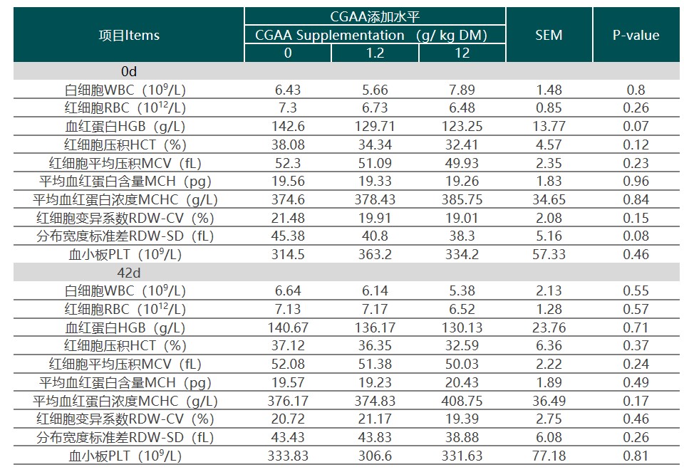 試驗結果顯示,無論是推薦有效劑量(1.2g/kgDM)還是10倍超高耐受劑量(12g/kgDM),包被胍基乙酸對肉牛試驗始末的白細胞、紅細胞、血紅蛋白、血小板等血常規各項核心指標,均無顯著不良影響(P>0.05),所有指標均處于肉牛正常生理范圍。