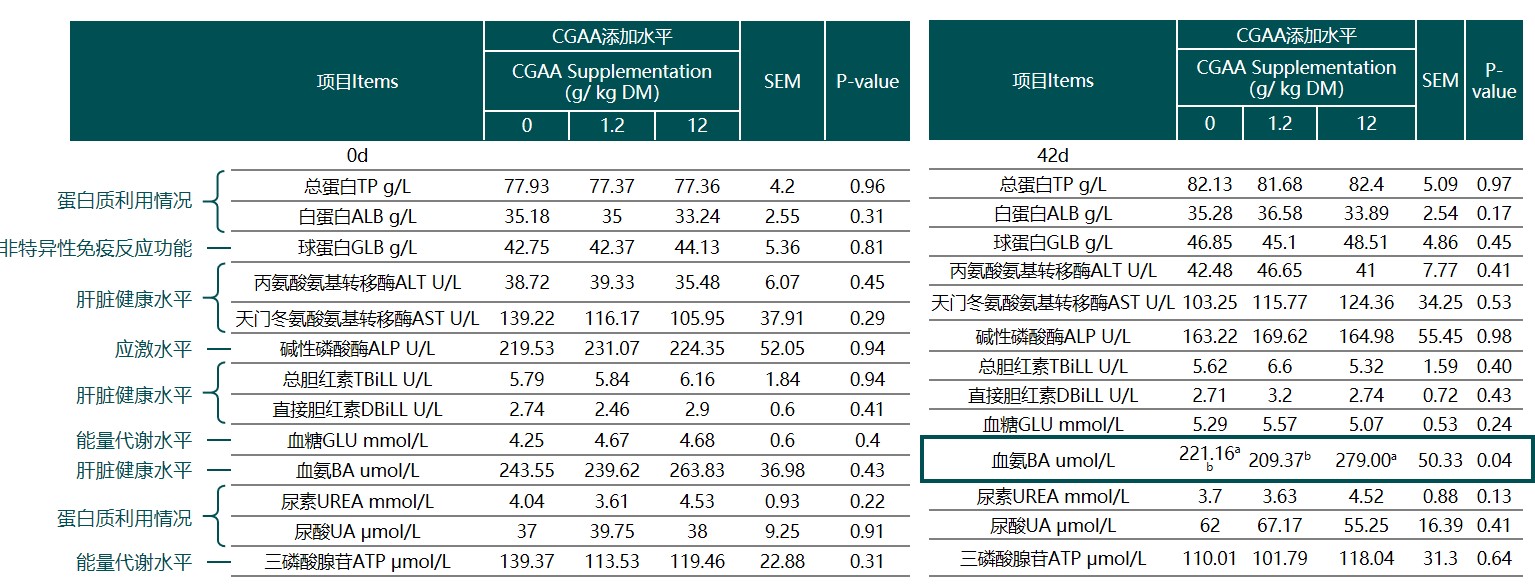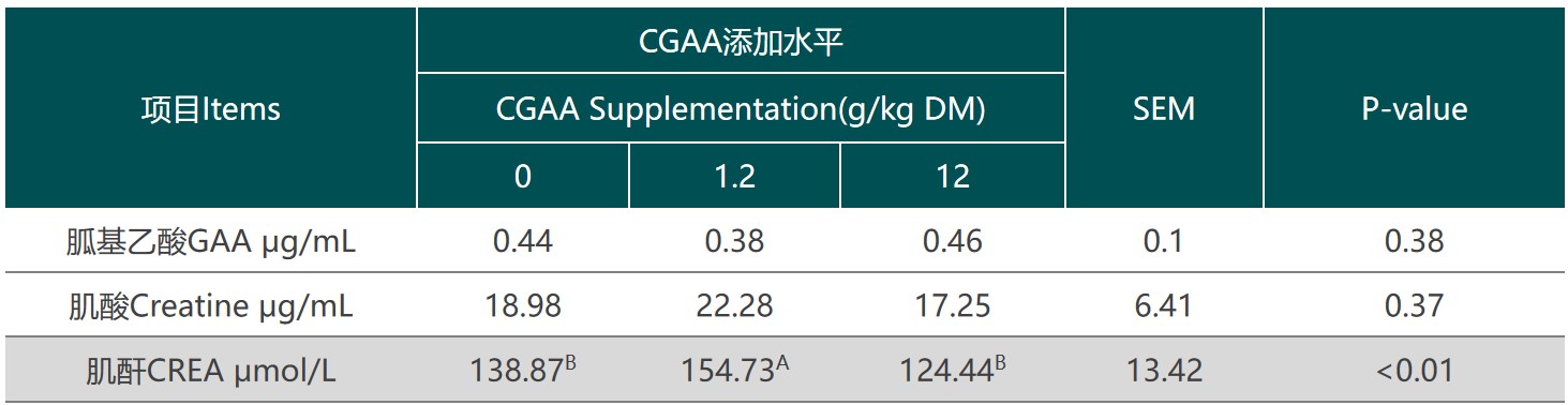試驗結果顯示,10倍超高耐受劑量的CGAA,對肉牛血清中胍基乙酸(GAA)和肌酸含量無顯著影響(P>0.05),未出現有效成分在機體內的異常蓄積情況;推薦有效劑量(1.2g/kgDM)的CGAA可顯著提高肉牛血清肌酐(CREA)含量(P<0.01)。