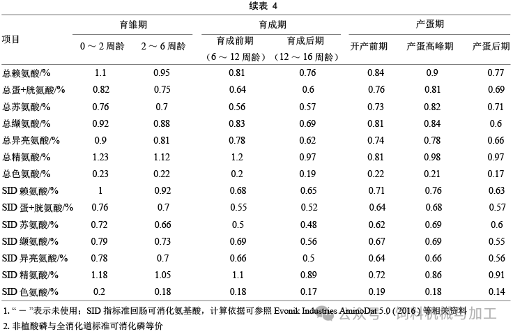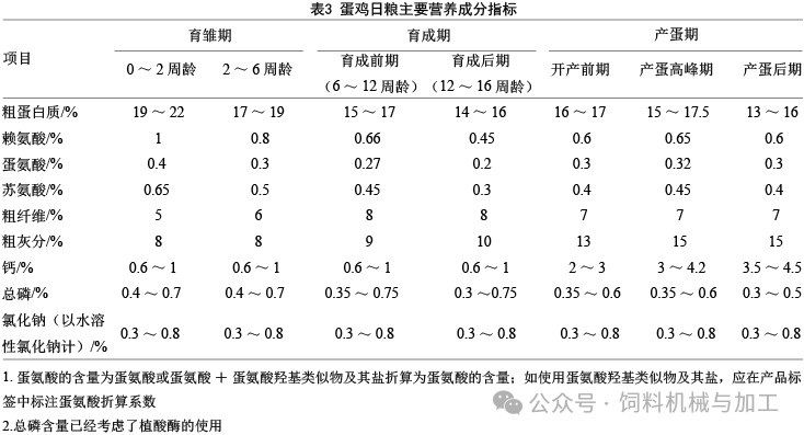 2.2 合理設置日糧有效能水平 參考有關飼養標準(GB/T 5916)或不同廠家蛋雞品種(品系)飼養手冊,結合蛋雞不同生理階段的特點,首先確定所配制日糧適宜的有效能水平,根據品種(品系)推薦的有效能需要量,確定其他營養成分的相應比例。