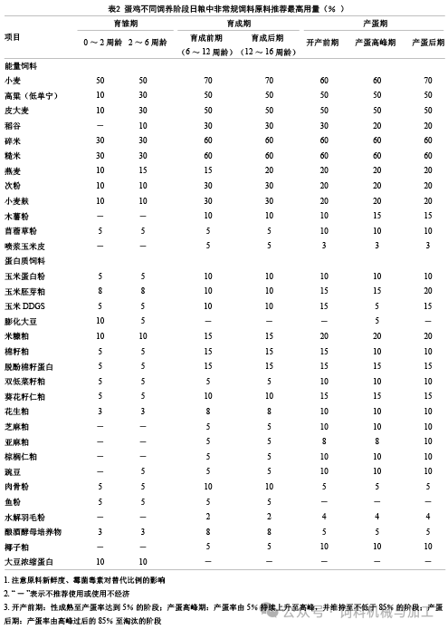 1.3 非常規飼料原料的推薦最高用量 蛋雞不同飼養階段日糧中非常規飼料原料的推薦最高用量見表2。