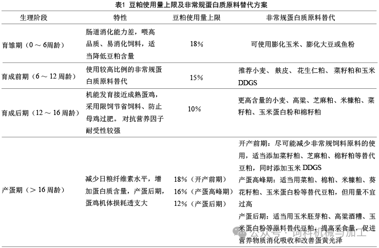 3.3 雜粕等蛋白原料替代豆粕 蛋雞育雛期日糧中,可單獨或搭配使用棉籽餅粕、菜籽餅粕替代豆粕,建議替代比例不超過 5%,維持 15% 以上的豆粕用量。蛋雞育成期日糧中,可搭配使用棉籽餅粕、菜籽餅粕、葵花粕、米糠粕替代豆粕,每種雜粕用量建議在 5% ~ 8% 之間,替代豆粕用量 15% 左右;蛋雞產蛋期日糧中,可搭配使用棉籽餅粕、菜籽餅粕(各8%~10%)和玉米蛋白粉(3%~5%)替代豆粕,豆粕用量可降至 8% 以下。