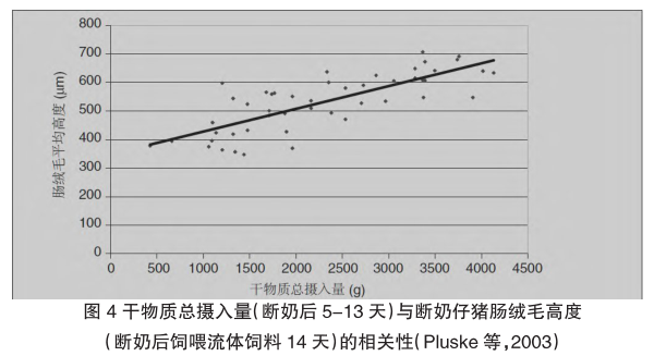 研究發現,斷奶后第1周(特別是頭3天)的采食量是非常關鍵的。斷奶后第1天的采食量>50克才能基本維持仔豬不掉膘。采食量高是斷奶仔豬更快生長的保障。如果斷奶后頭3天采食量不足引起掉膘,商品豬的出欄時間至少推遲1周,甚至更多(如圖2和圖3)。斷奶后保持充足的采食量是維護腸道粘膜結構和功能完整的基礎,因為干物質攝入量與腸道絨毛高度、絨毛完整性呈正相關關系(如圖4)??梢钥闯?,采食量低是最根本的誘因,因此如何增加斷奶仔豬的采食量且不腹瀉是無抗斷奶仔豬料的核心技術。