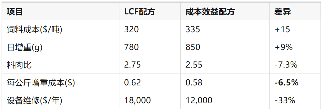 LCF配方雖每噸飼料便宜$15,但因FCR惡化,每公斤增重成本反而高出6.9%。
