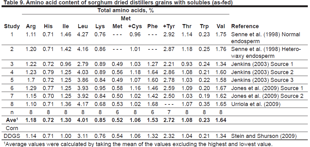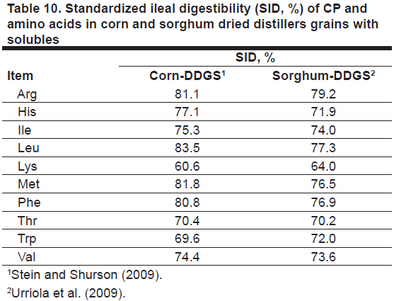 目前,對高粱DDGS中氨基酸消化率的評估局限于單一的研究。研究顯示高粱DDGS、玉米DDGS中賴氨酸的SID相似,但高粱DDGS中,除異亮氨酸、蘇氨酸、色氨酸和纈氨酸外的其它多數氨基酸的SID均低于玉米DDGS(表10)。近期的研究也表明,高粱氨基酸的SID低于玉米,這可能與高粱中高纖維、低脂肪水平相關。