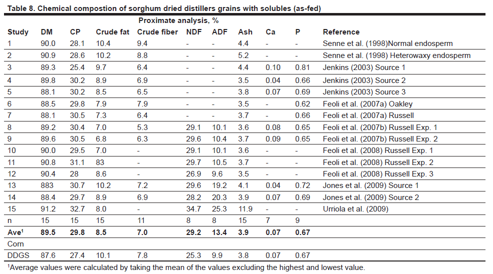一般來講,與玉米DDGS相比,高粱DDGS中粗蛋白、中性洗滌纖維、酸性洗滌纖維水平較高,而粗脂肪水平較低。這反應了利用高粱、玉米生產乙醇的差異(表8)。兩種DDGS中鈣、磷水平相似。