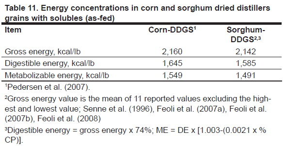 高粱DDGS的總能與玉米DDGS相似。但是,其總能的消化率低于玉米DDGS。近期的一篇綜述報道,玉米DDGS總能的表觀總腸道消化率變化范圍為73.9%—82.8%,平均值為76.8%。高粱DDGS的這一指標為74%,低于玉米DDGS的平均值但在其數值范圍內(表11)。